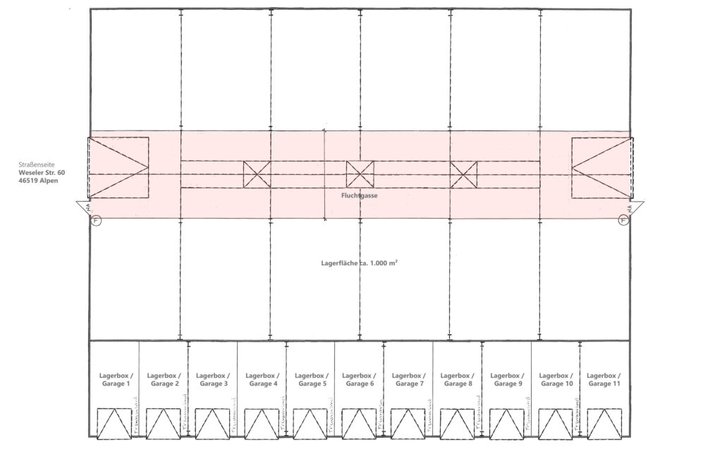 11 Lagerboxen (Garagen) mit je ca. 25 m² (3,62 x 7,00 m)